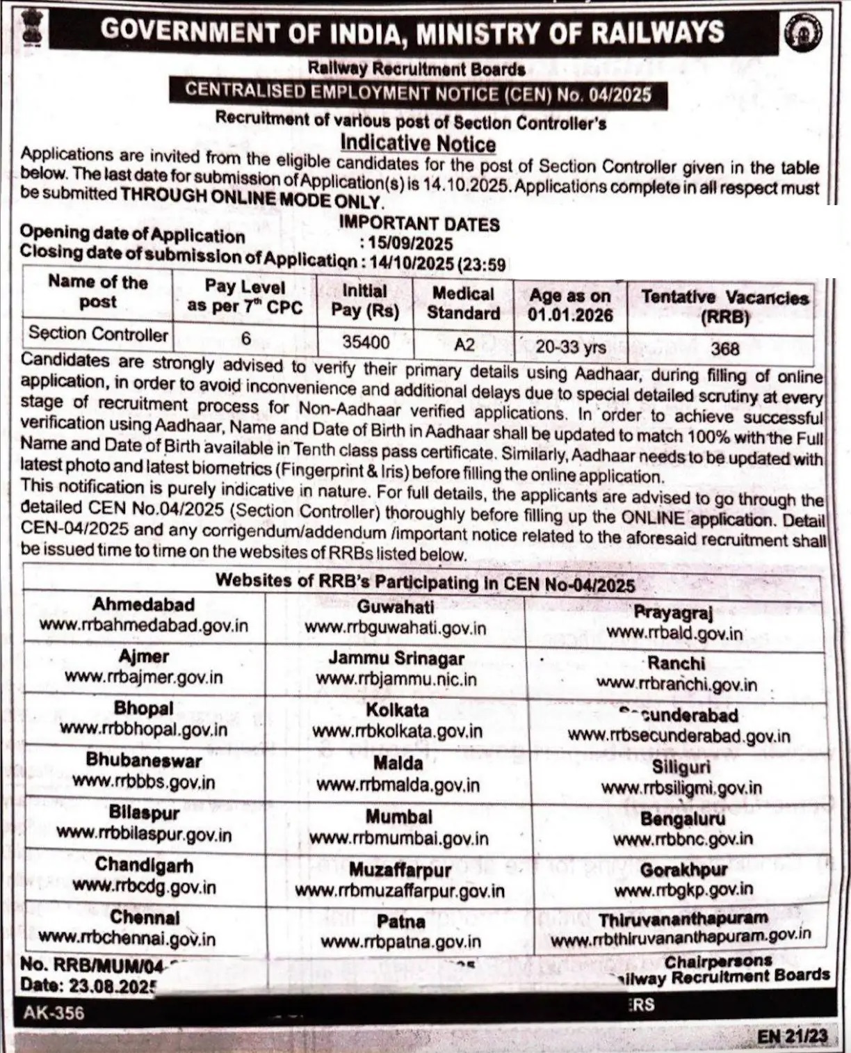 Railway Recruitment Board (RRB), has released the Application status on its official website for the Recruitment of RRB Section Controller Online Form 2025. RRB Application Form were accepted from 15 September 2025 to 14 October 2025.